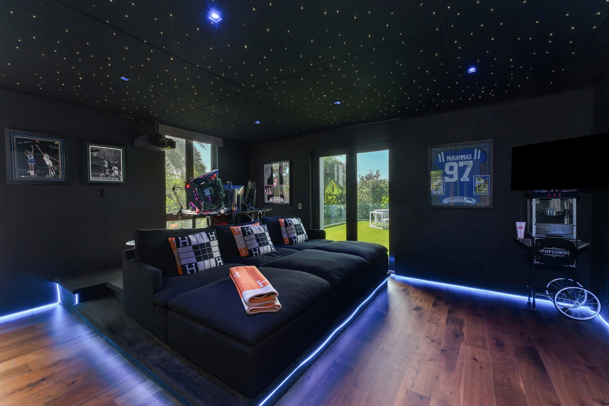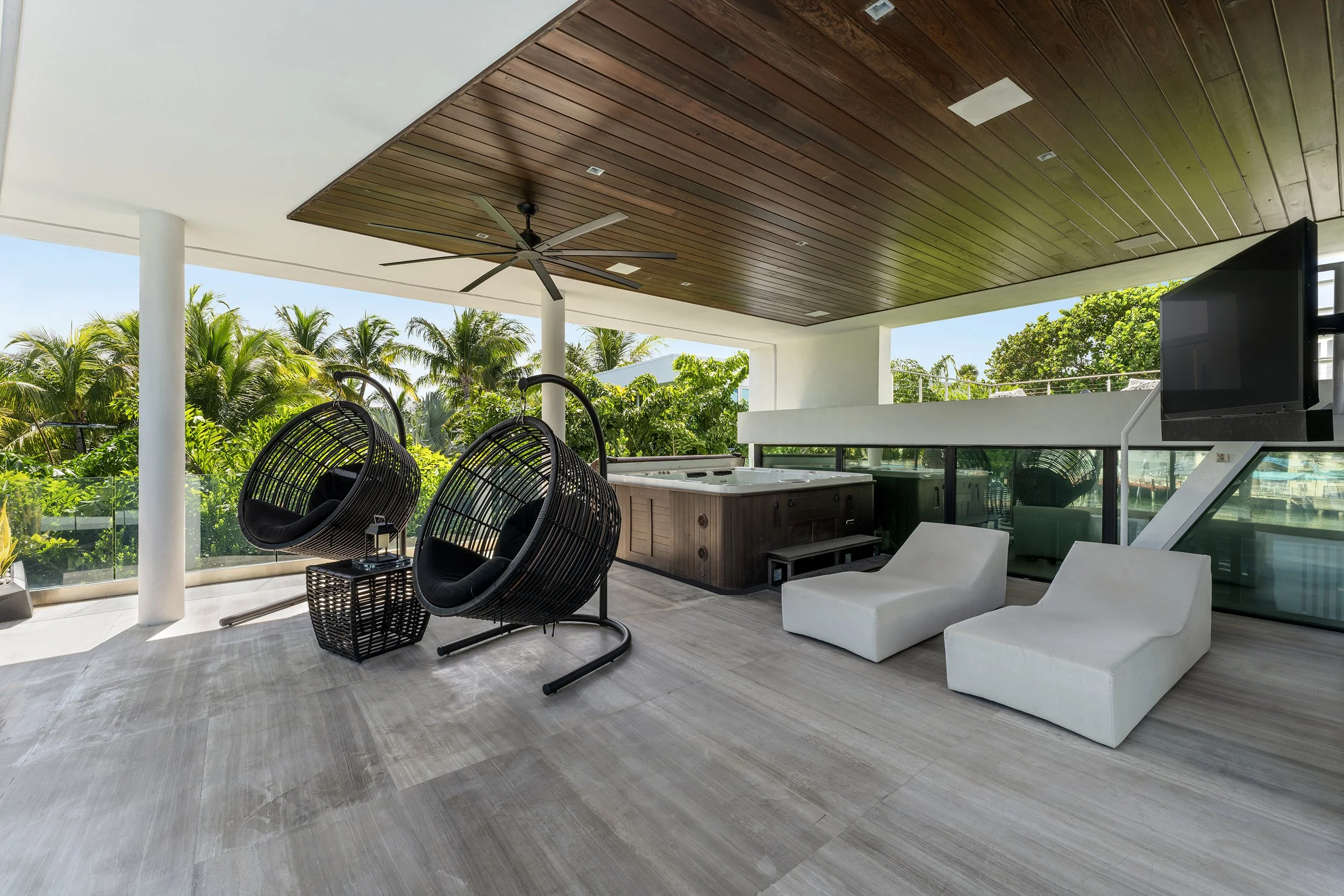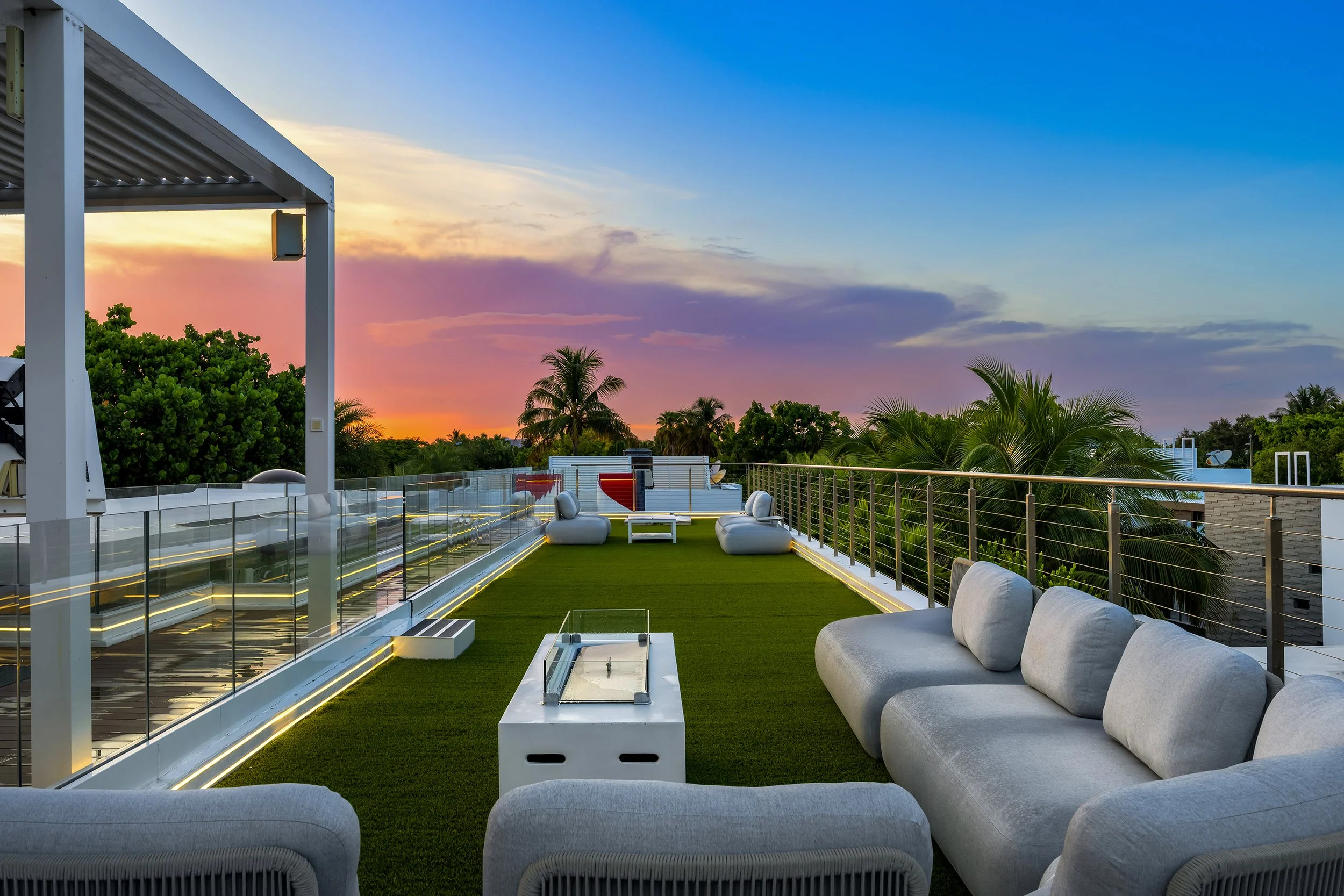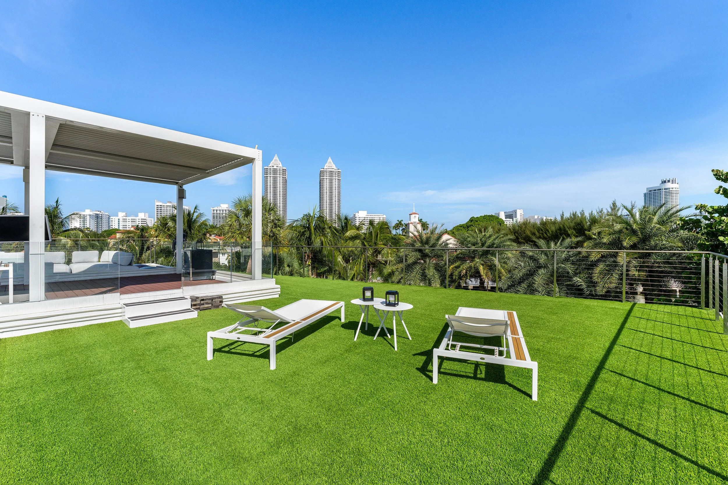 The principal suite is a private retreat, where a sprawling terrace captures serene water views, a spa-inspired bathroom indulges with luxurious fixtures, and a walk-in closet evokes a couture gallery. Four additional en-suite bedrooms envelop family or guests in comfort and style. The estate’s grandeur extends to a state-of-the-art home theater for immersive escapes, a converted garage-turned-gym for wellness devotees, and a rooftop lounge with a fire pit and outdoor television, where Miami’s velvet skies become a canvas for unforgettable nights.
