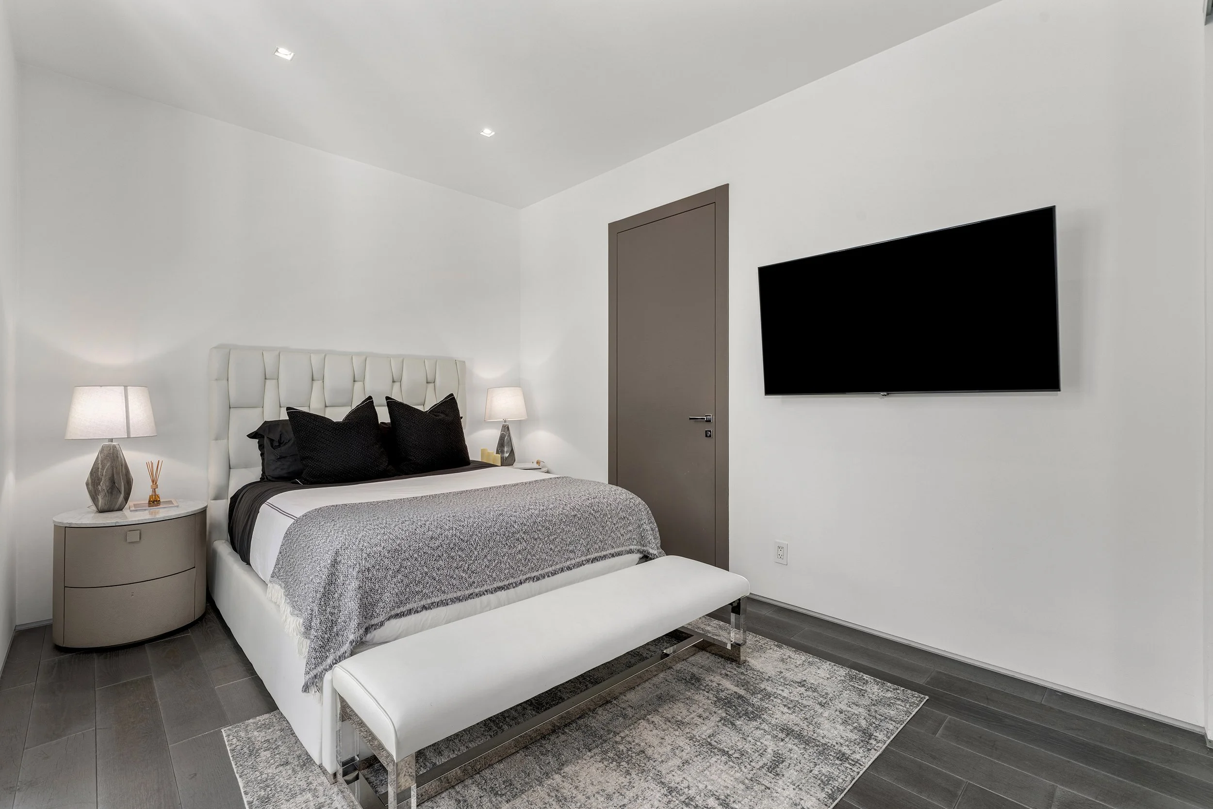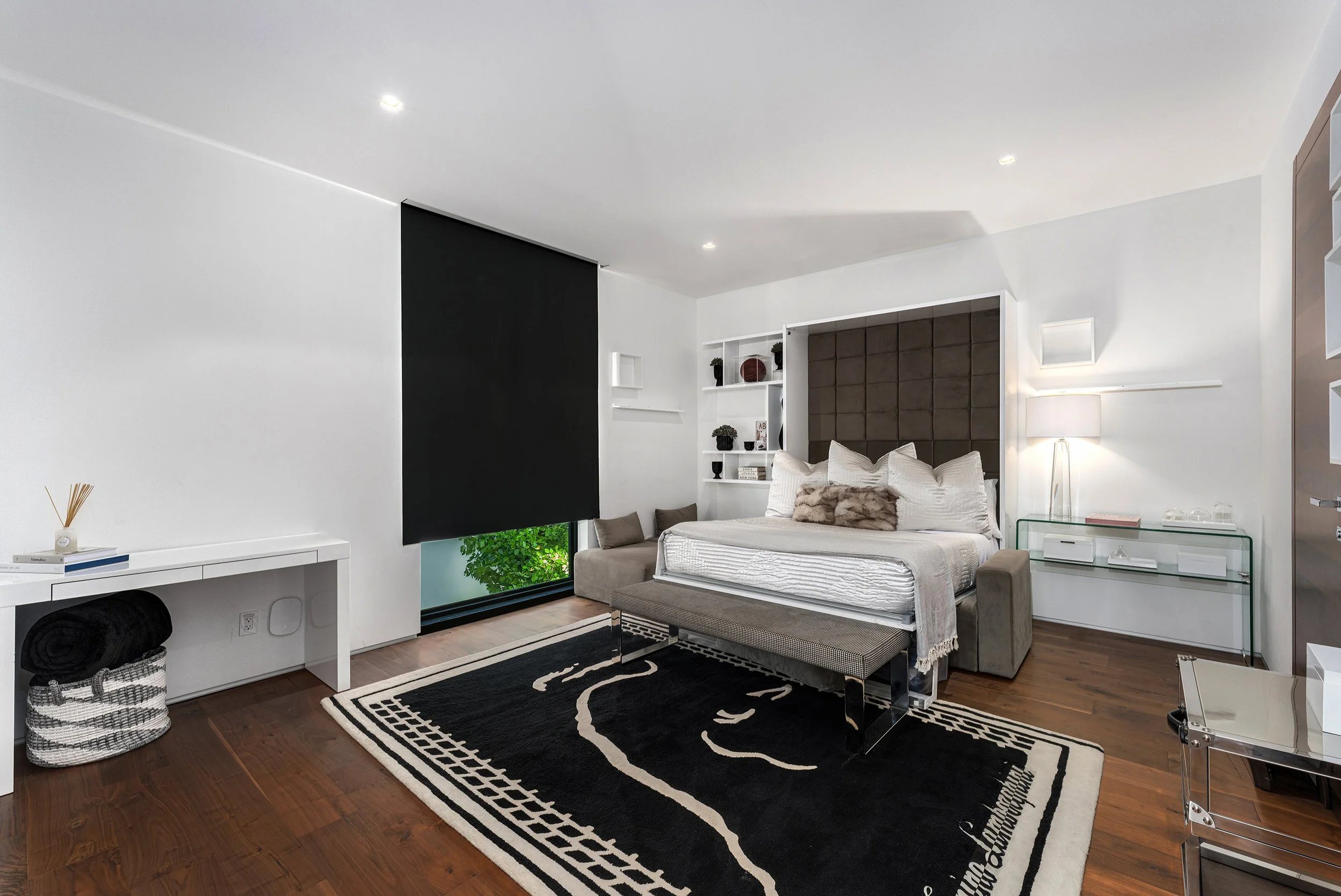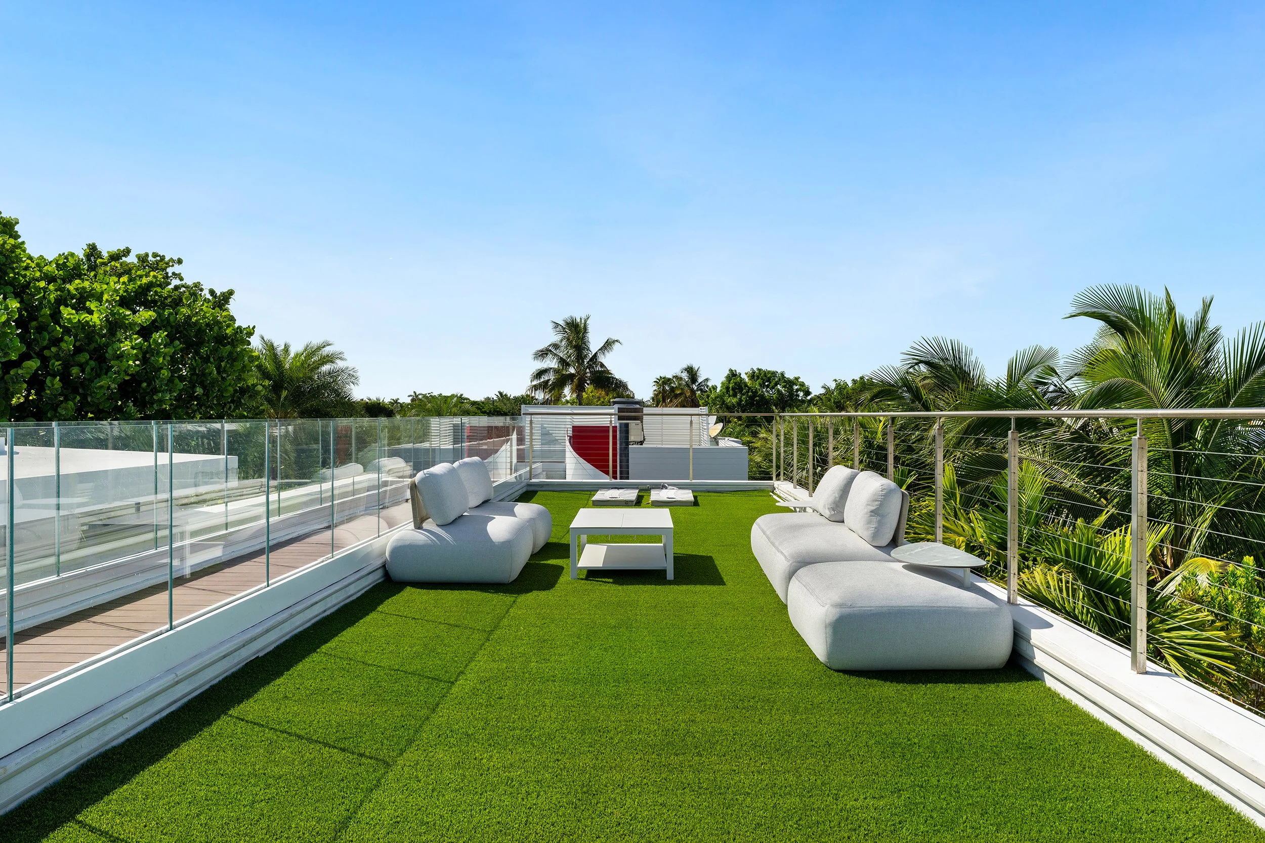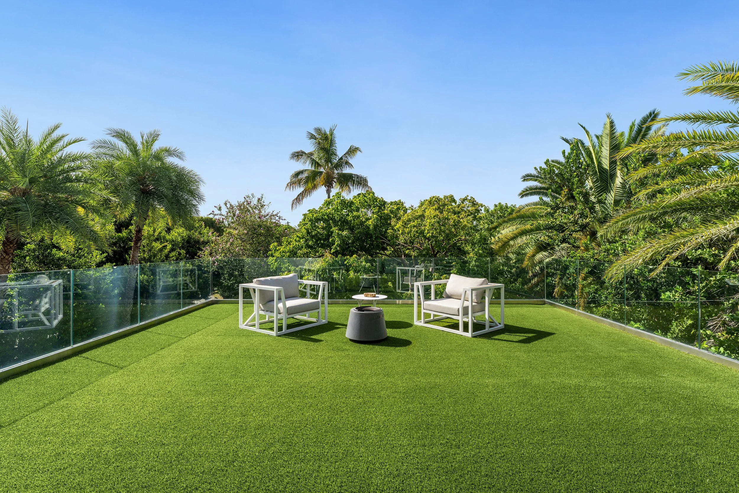 The principal suite is a private retreat, where a sprawling terrace captures serene water views, a spa-inspired bathroom indulges with luxurious fixtures, and a walk-in closet evokes a couture gallery. Four additional en-suite bedrooms envelop family or guests in comfort and style. The estate’s grandeur extends to a state-of-the-art home theater for immersive escapes, a converted garage-turned-gym for wellness devotees, and a rooftop lounge with a fire pit and outdoor television, where Miami’s velvet skies become a canvas for unforgettable nights.