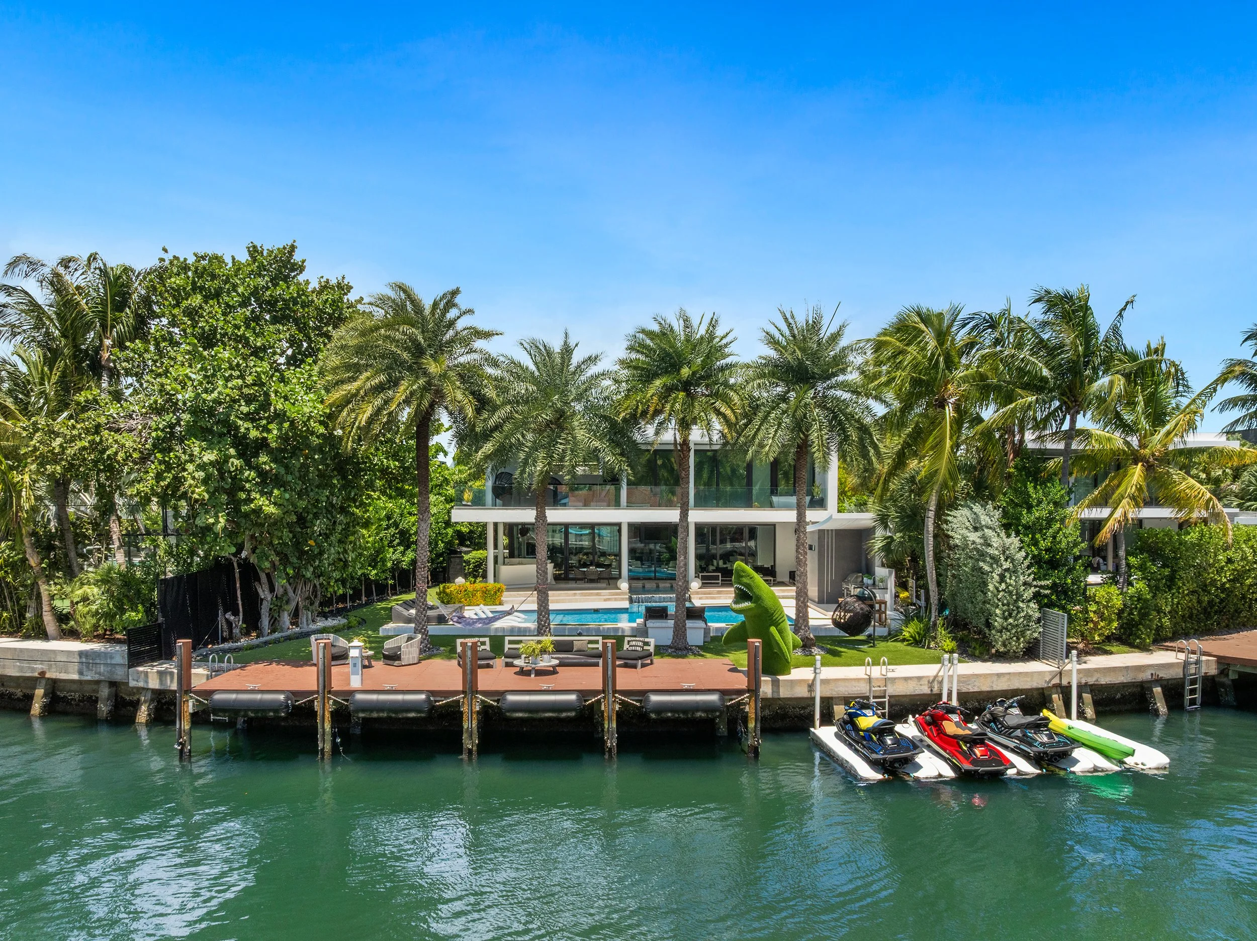 The chef’s kitchen, a haven of culinary sophistication, gleams with Wolf and Miele appliances set against sleek cabinetry, inviting both intimate meals and lavish gatherings. It opens effortlessly to a resort-style backyard, where a heated pool shimmers beneath a cascading waterfall, a summer kitchen sparks al fresco dining, and a custom bar sets the stage for starlit soirées. A 45FT private dock, accompanied by three jet ski slips, offers direct access to Biscayne Bay, turning every evening into an opportunity for adventure.